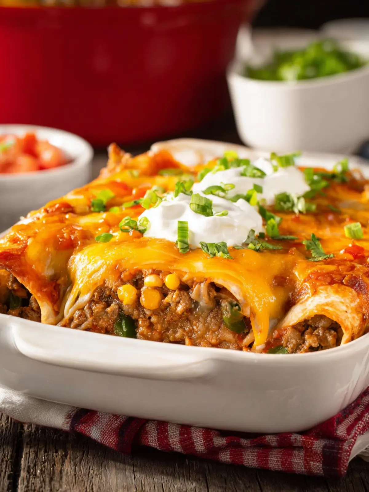A delicious cheesy enchilada recipe with layers of flavor and ingredients.