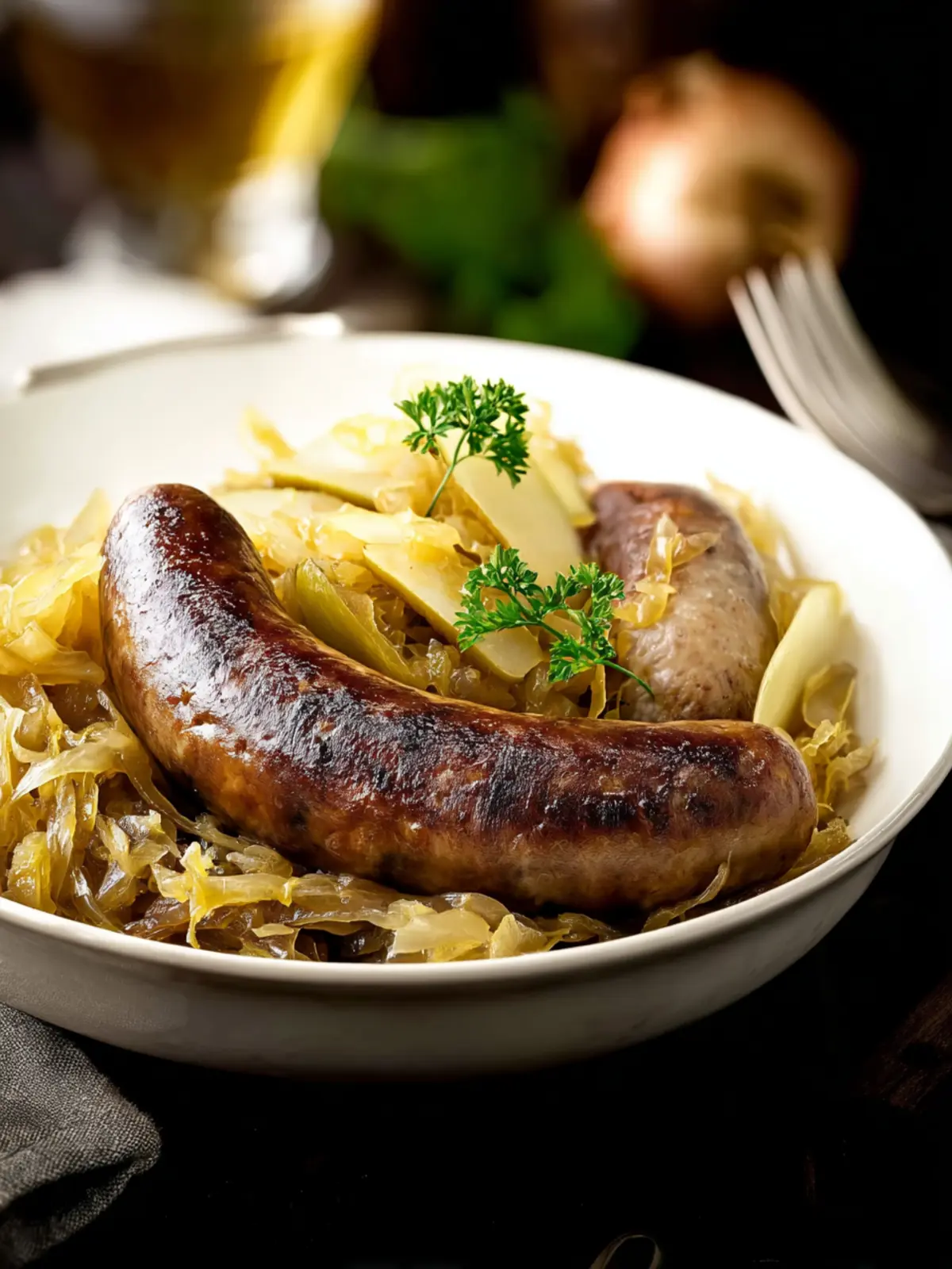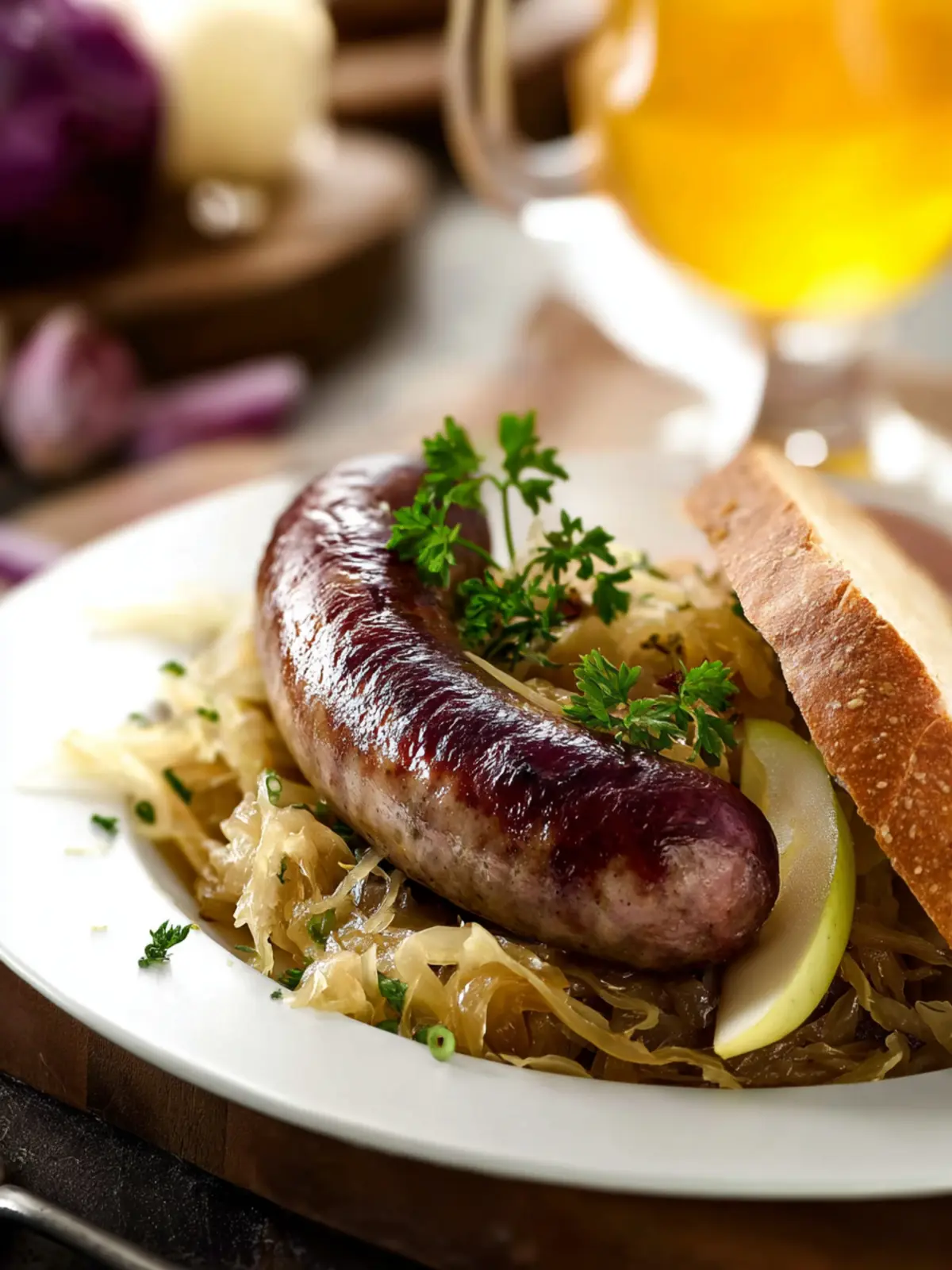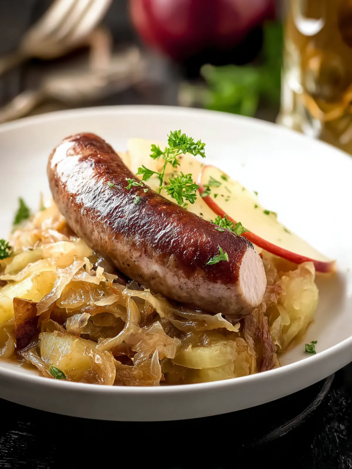 A delightful dish combining bratwurst, apple, and sauerkraut, perfect for a hearty meal.