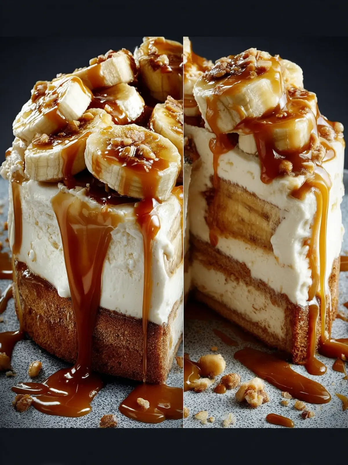 A Perfect Combination: This cake marries two beloved desserts: banana bread and ice cream. The blend not only satisfies cravings for sweetness but also offers a delightful contrast of textures—from the soft bread to the smooth ice cream and sticky caramel.
