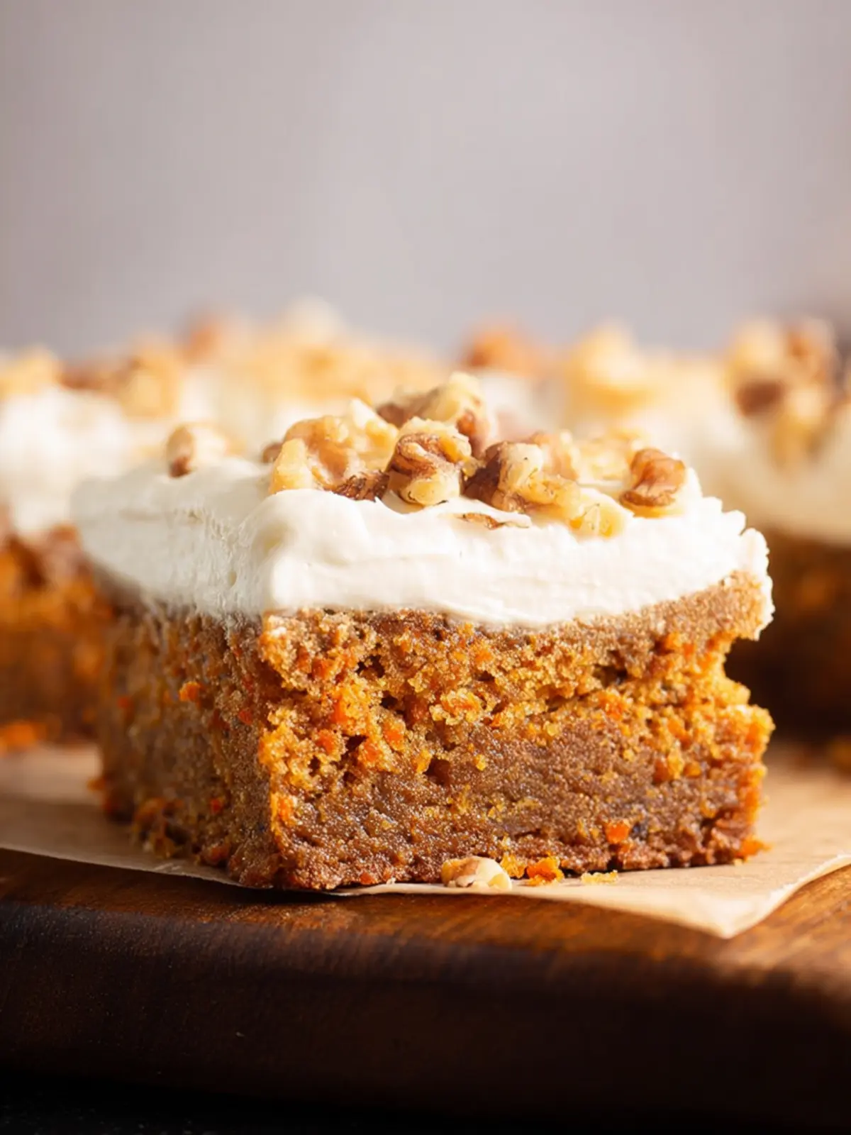 Delicious and moist carrot cake blondies topped with cream cheese frosting and walnuts.