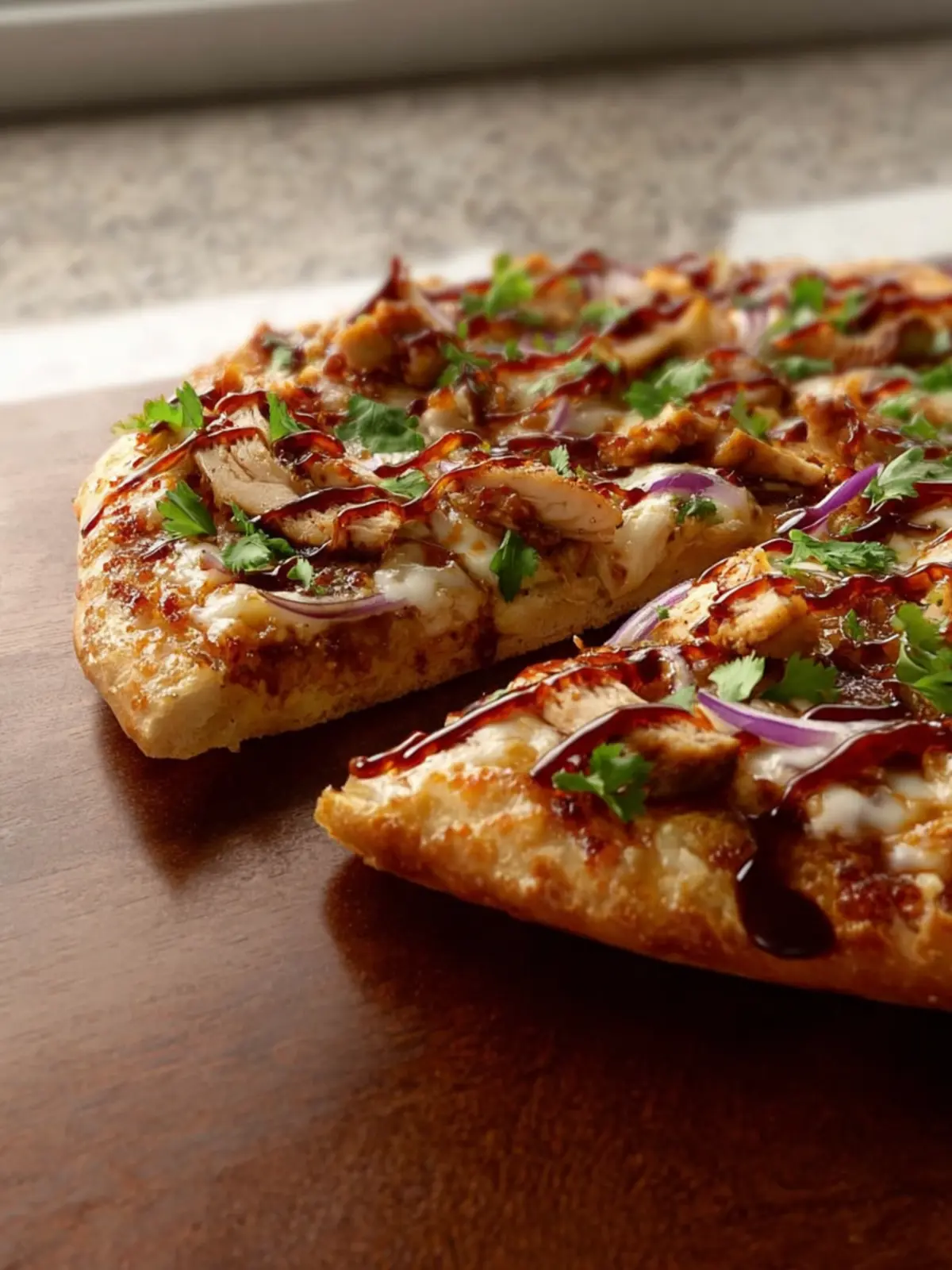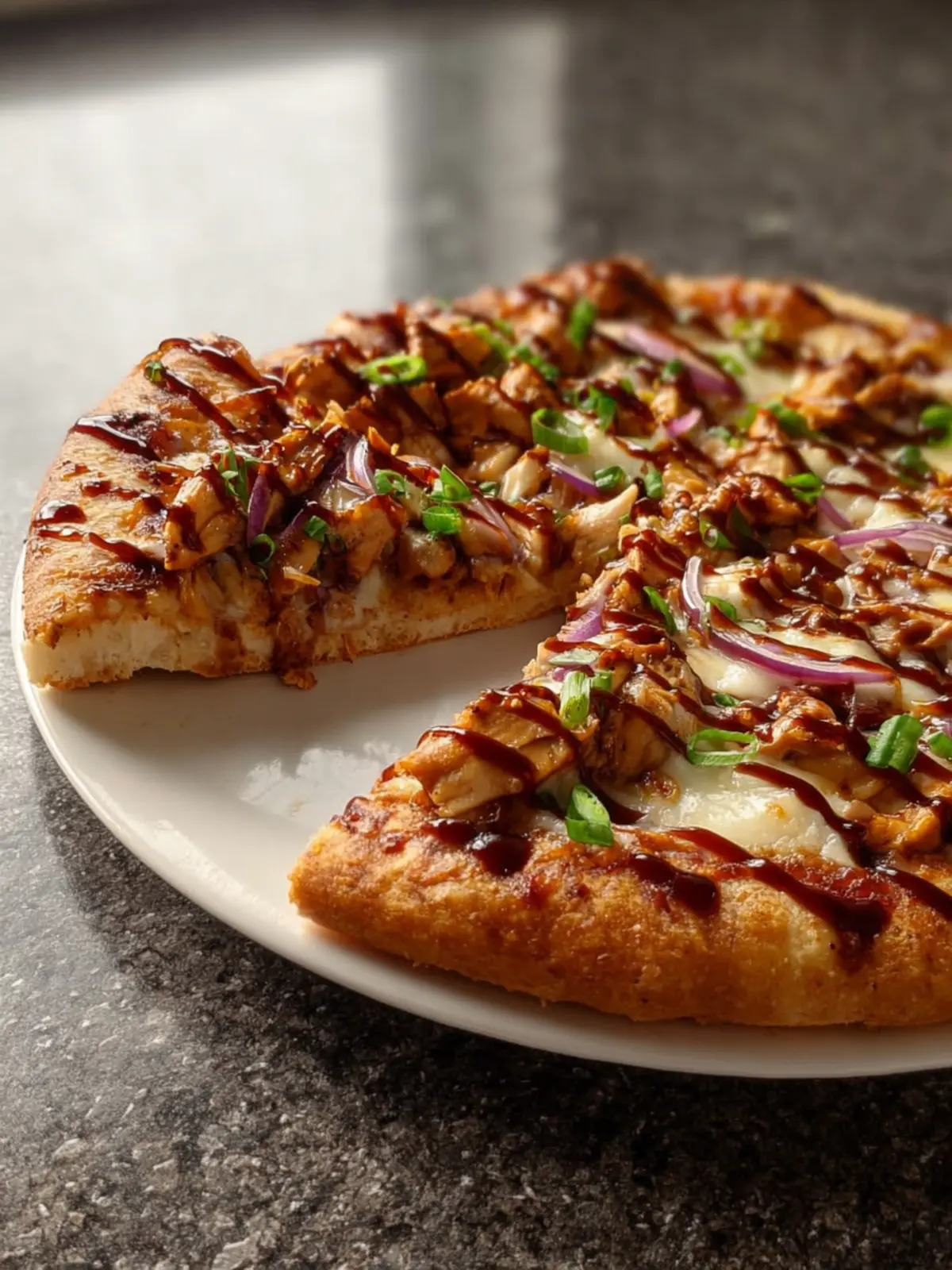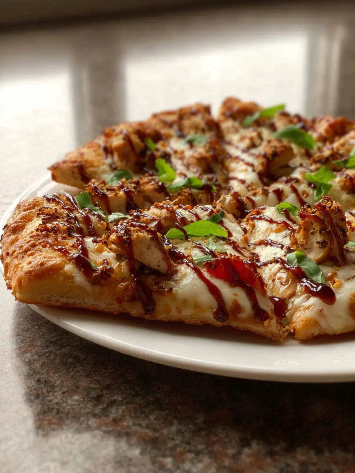 This delicious barbecue chicken pizza features a crispy crust topped with a blend of cheeses, tender chicken, and fresh vegetables.
