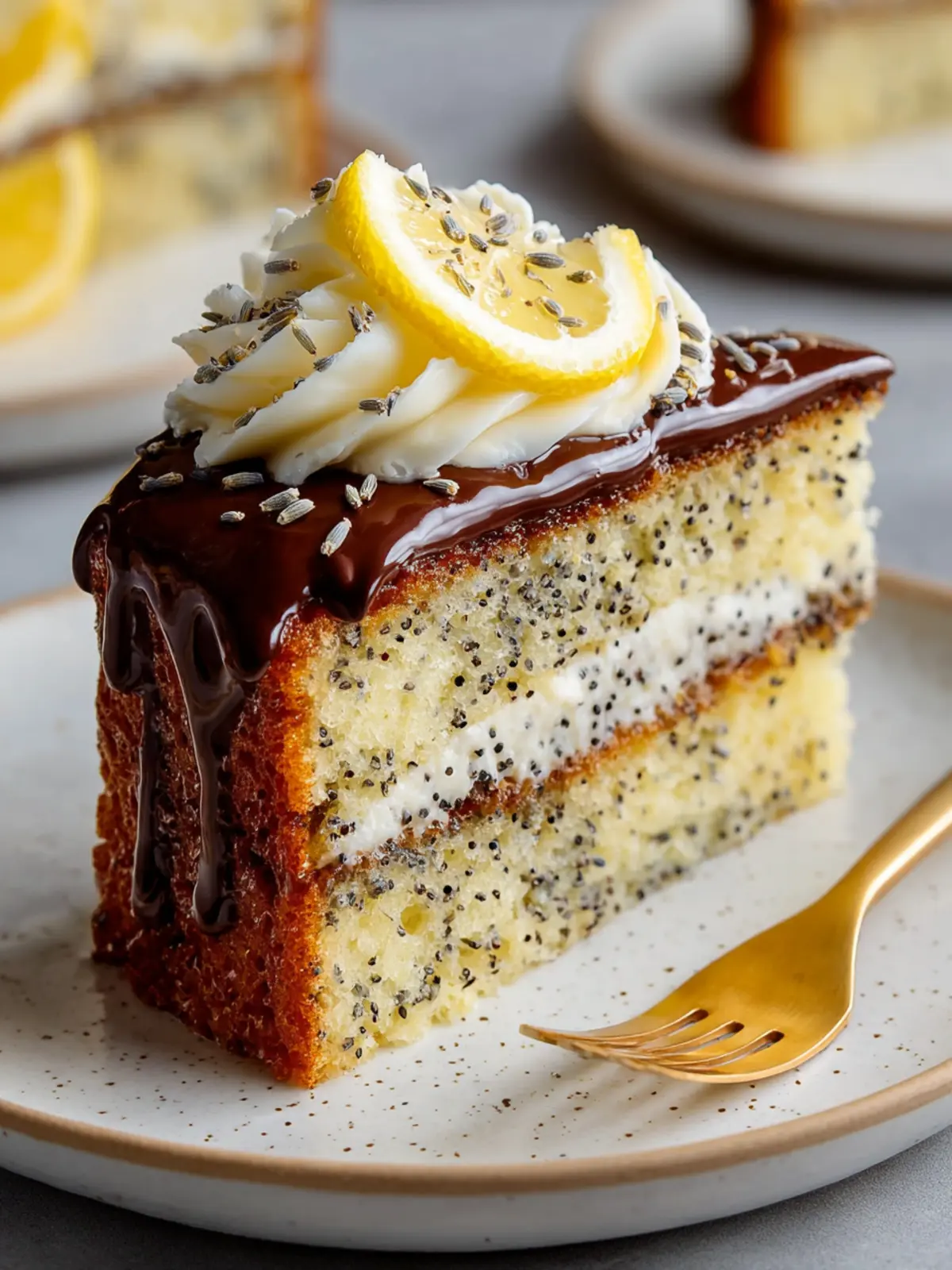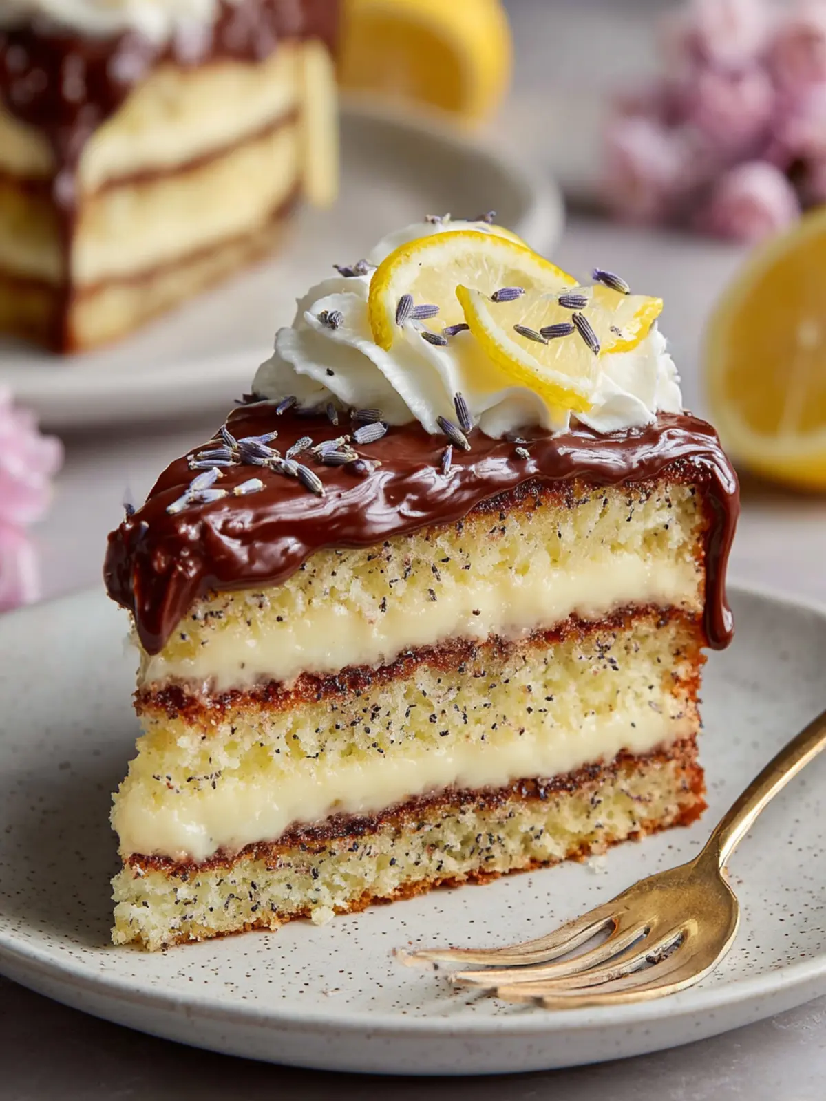 This delightful lemon poppy seed cake is layered with a rich chocolate lavender ganache and topped with a creamy lemon frosting.