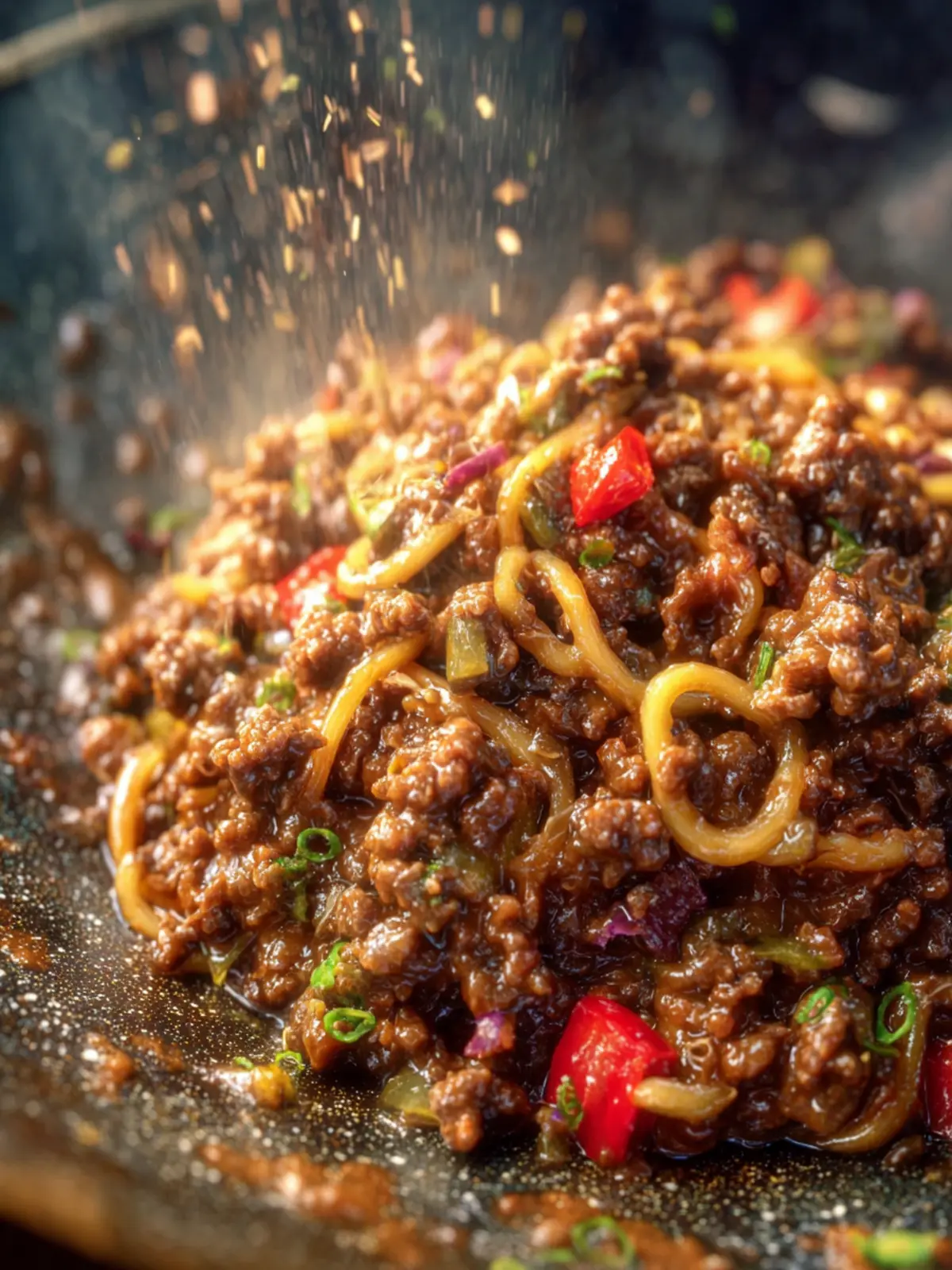 A savory dish featuring ground beef, noodles, and mixed vegetables in a Mongolian-style sauce.
