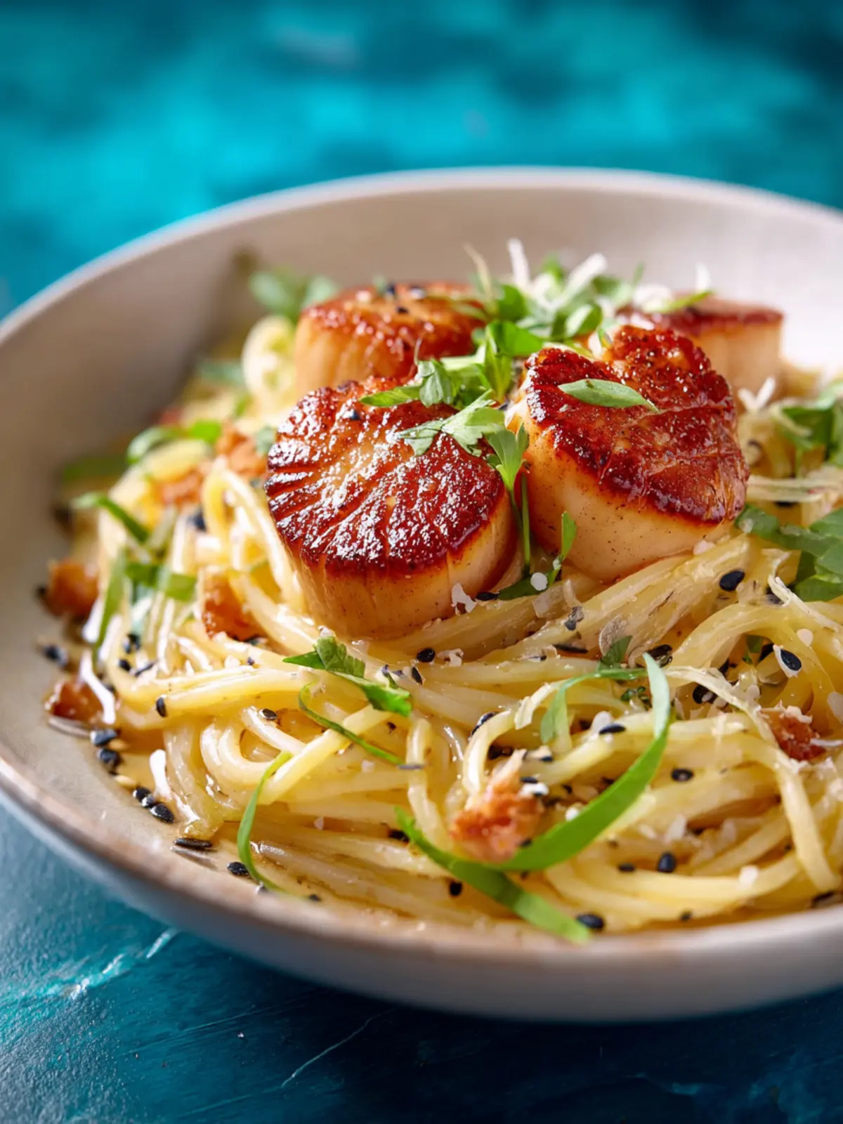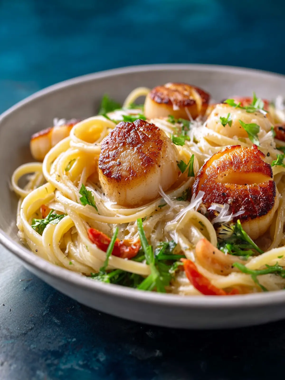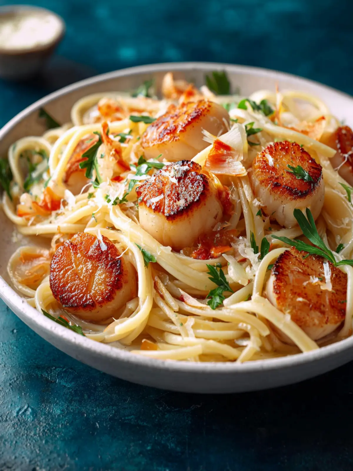 A delicious dish combining perfectly seared scallops and spaghetti in a creamy sauce with fresh parsley.