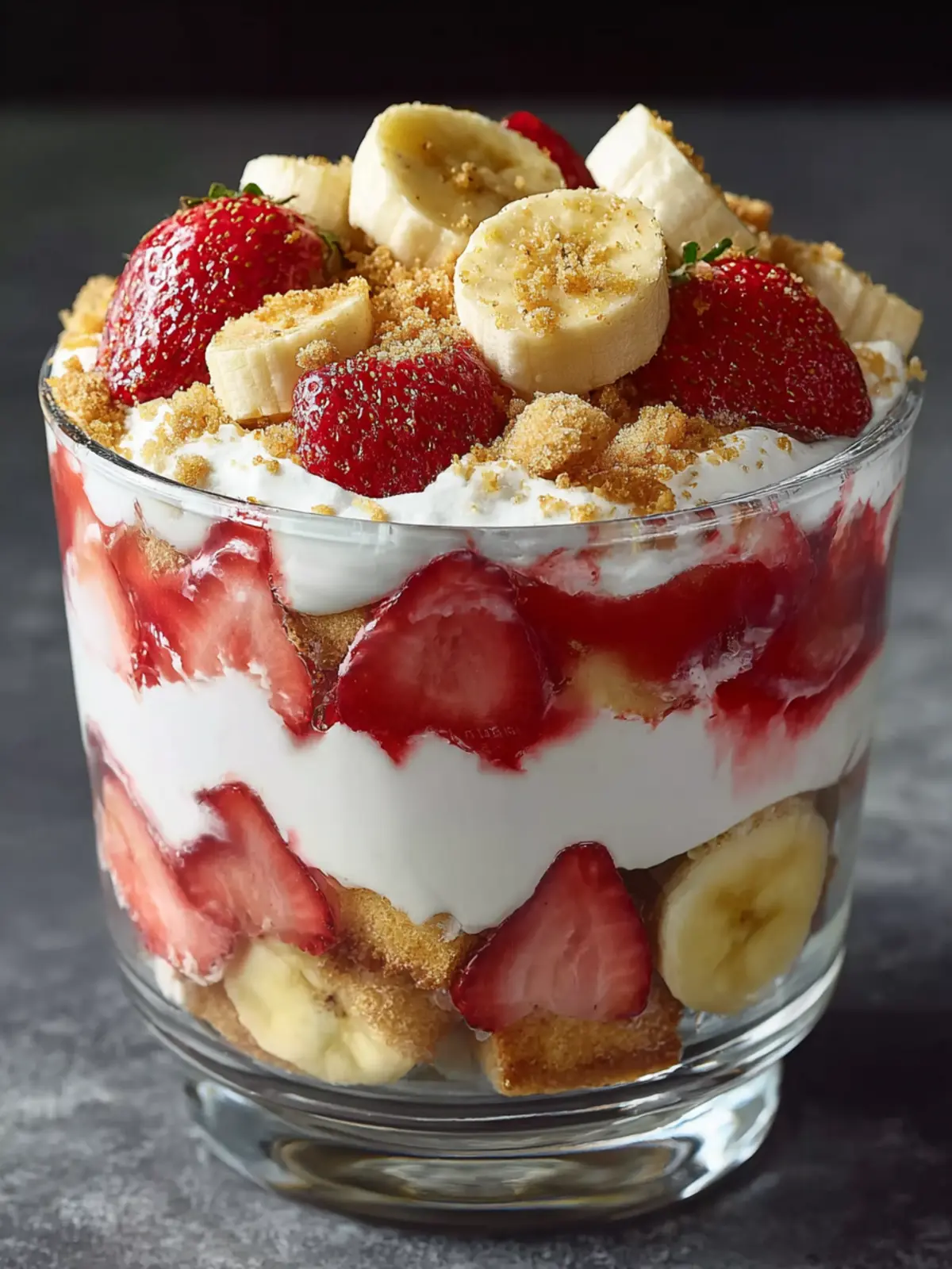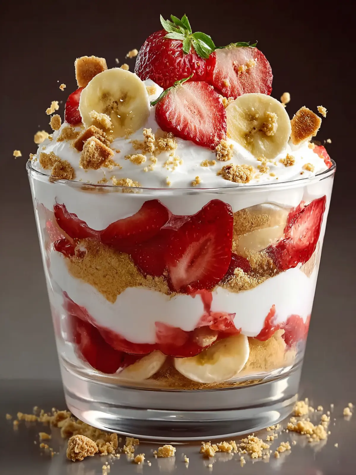A delicious layered dessert featuring vanilla pudding, cream cheese, bananas, strawberries, and graham crackers.