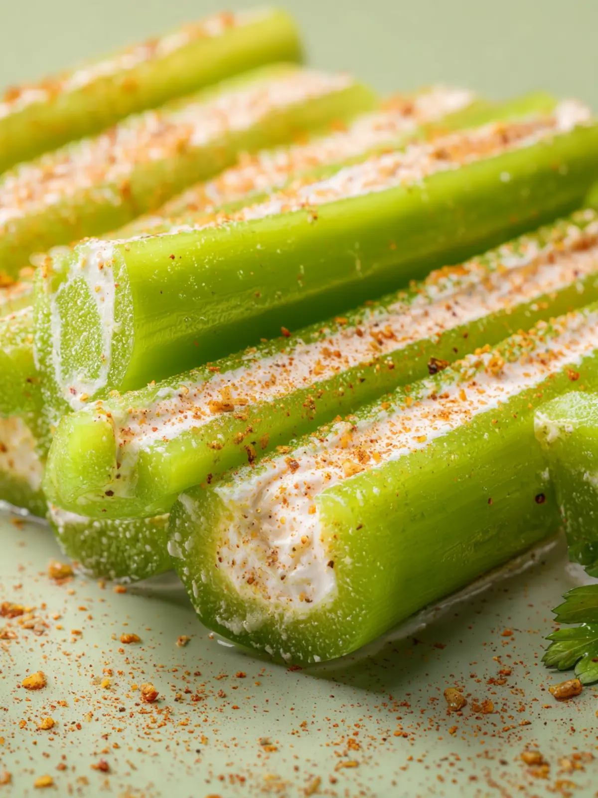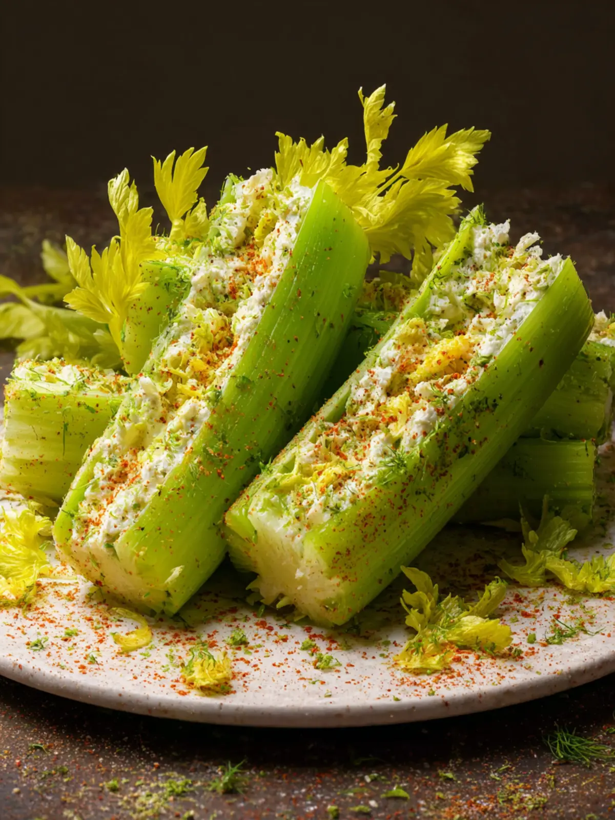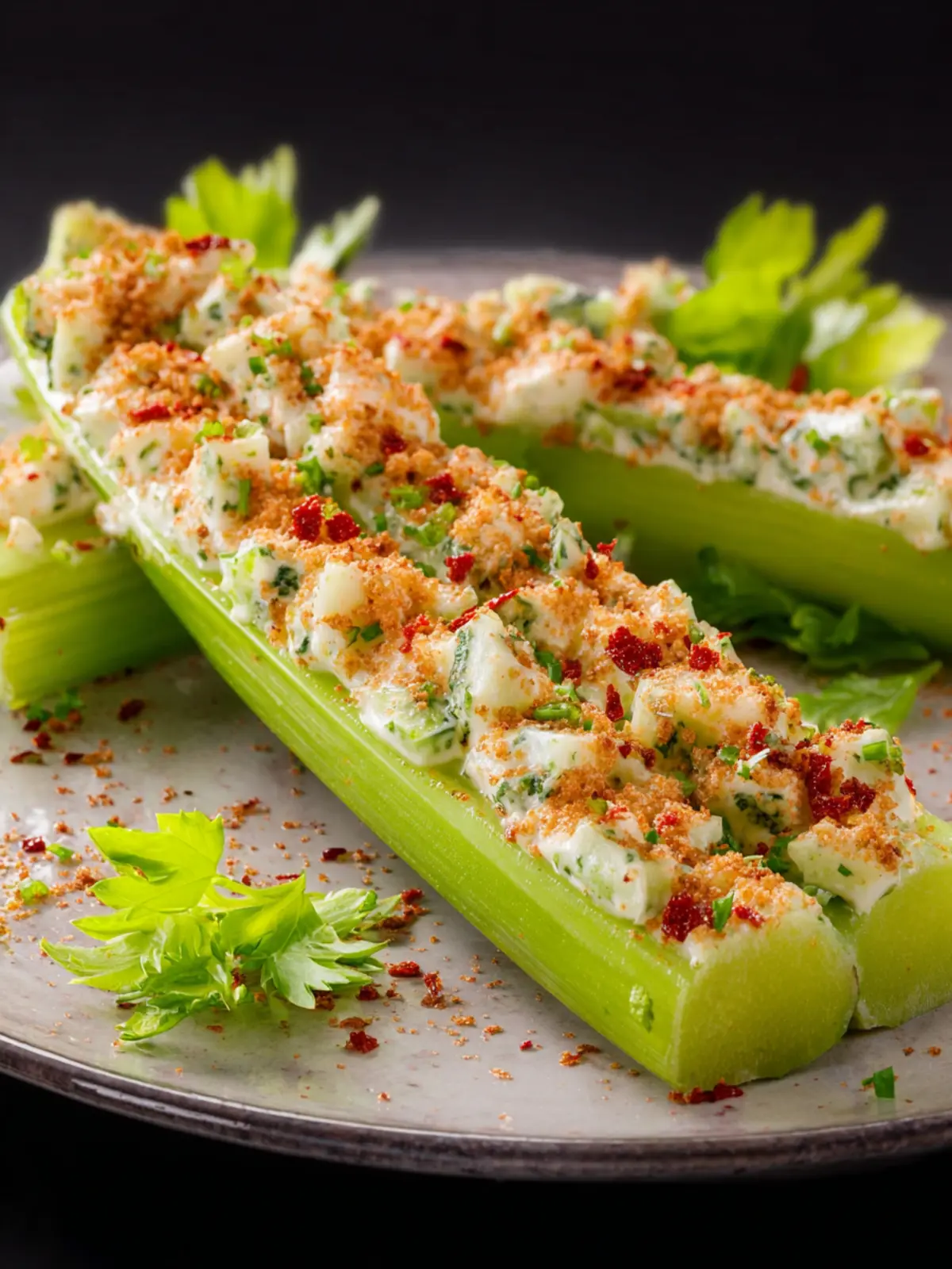Top each stuffed celery piece with fresh herbs like parsley or chives for a pop of color and an aromatic touch. A sprinkle of paprika or a drizzle of balsamic glaze can add visual interest and extra flavor too!