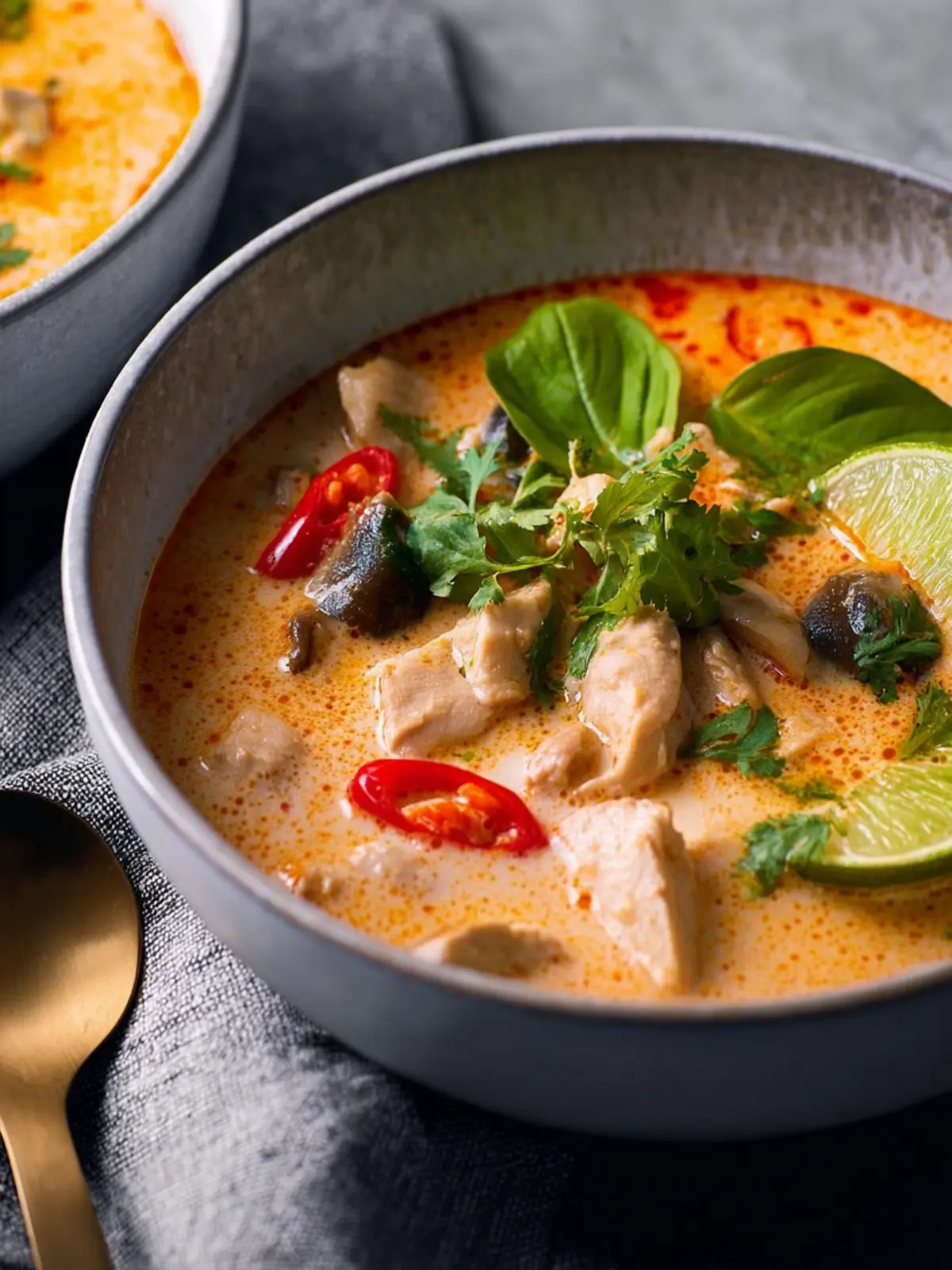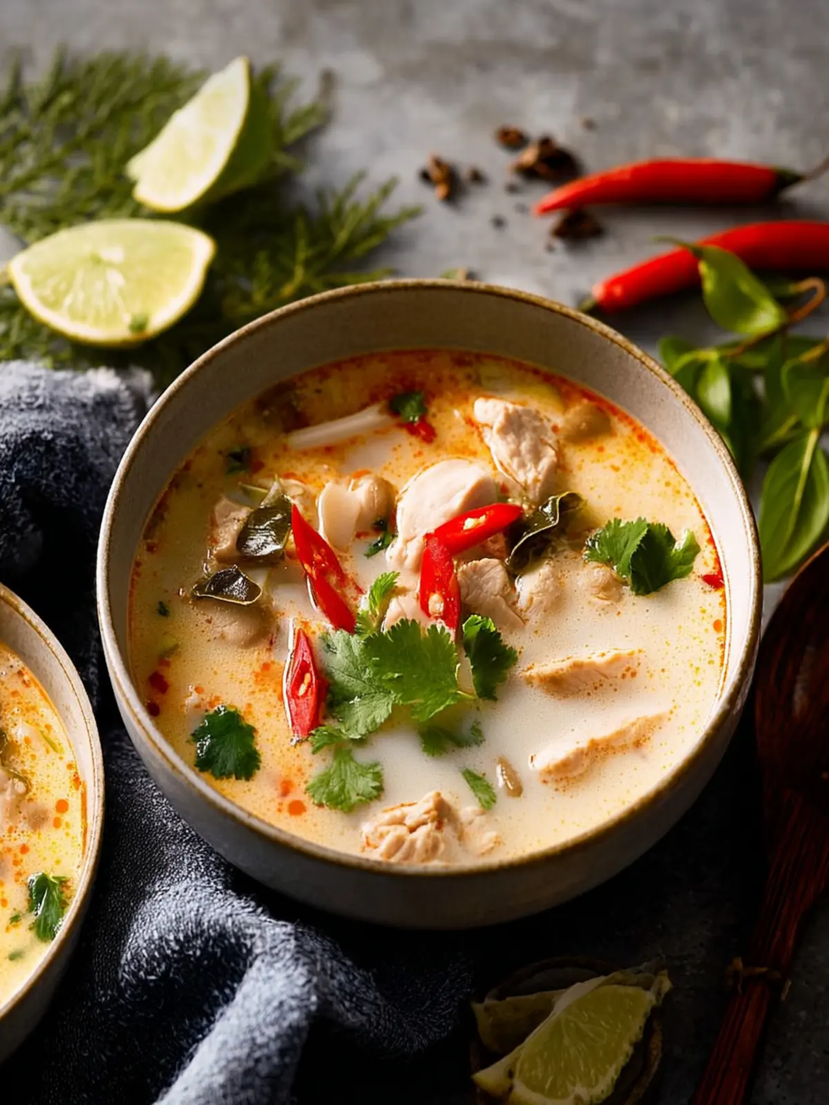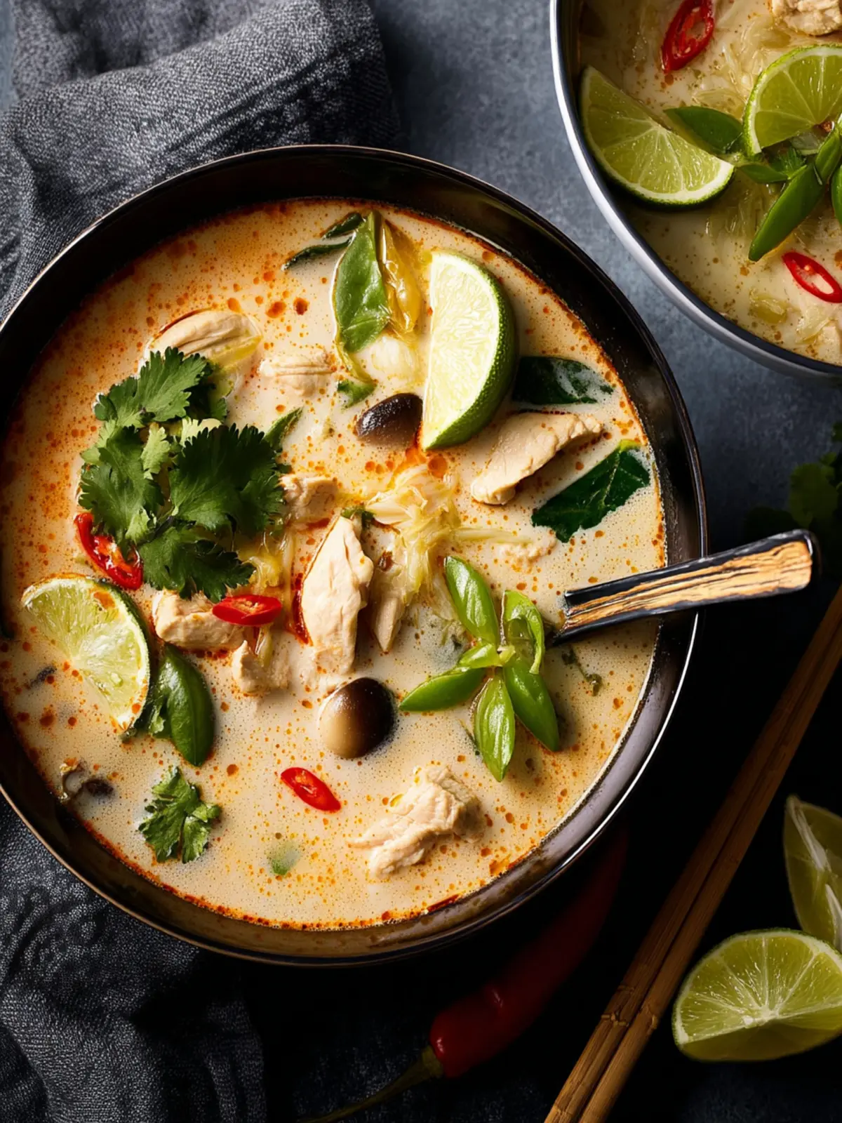 A delicious and aromatic Thai coconut chicken soup that is both comforting and flavorful.
