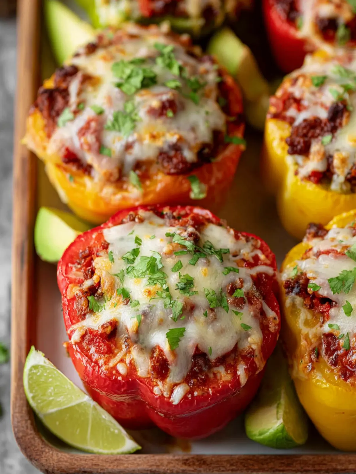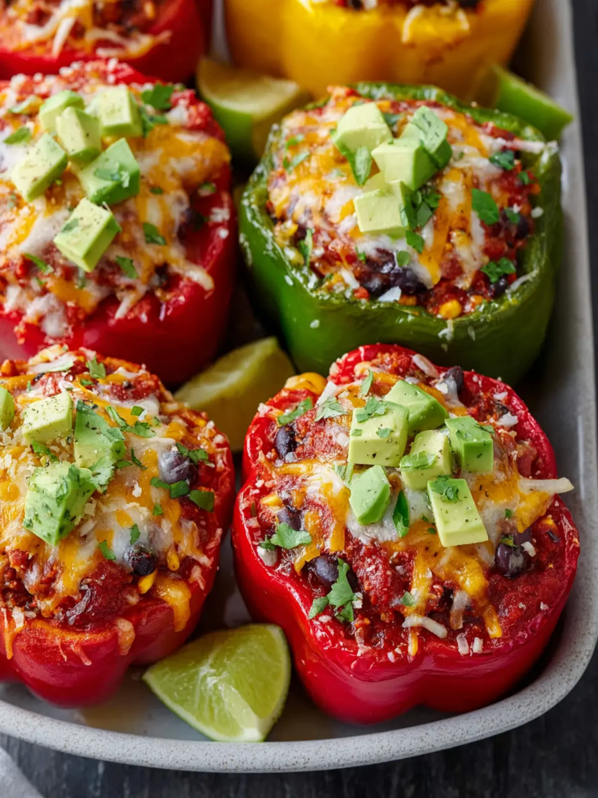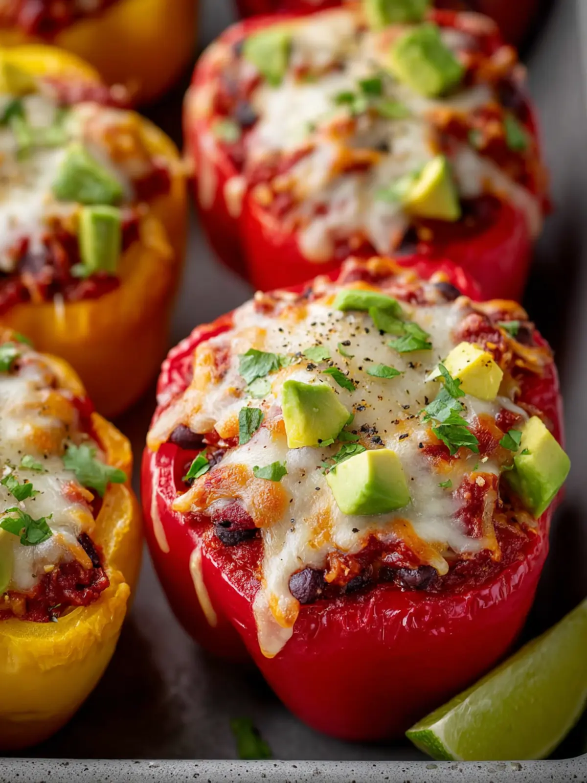 Delicious vegetarian stuffed peppers filled with a hearty mixture of brown rice, quinoa, black beans, and spices, topped with melted Monterey Jack cheese.